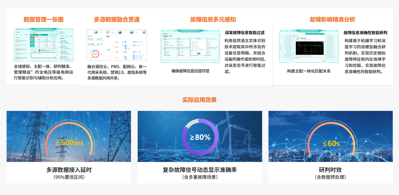 該系統深度融合配網多系統數據與AI大模型分析能力,實時接入主網調控、用采、故指、配自等多源異構數據,經標準化處理與統一分析,全面感知電網運行狀態。借助AI大模型算力,故障點定位精度超80%,60秒內可完成研判;還能基于結果智能生成復電路徑參考、檢修優先級排序等處理建議,為運維人員提供決策依據,推動配網故障處置從“被動響應”轉向“主動決策”。