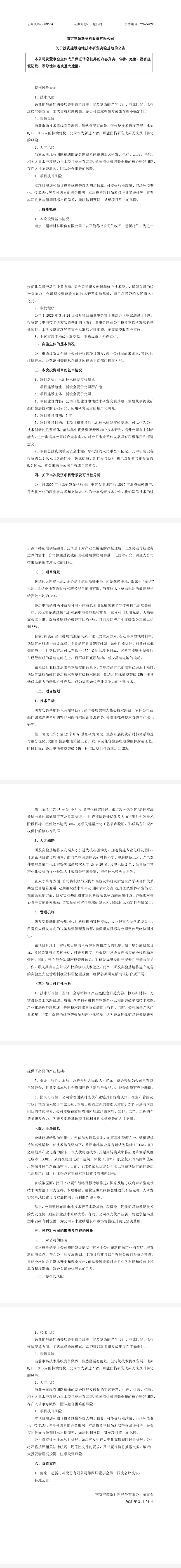 3月24日,三超新材發(fā)布《關于投資建設電池技術研發(fā)實驗基地的議案》公告,公司擬投資建設電池技術研發(fā)實驗基地,項目總投資約2.4億元。該項目旨在優(yōu)化公司產(chǎn)品和業(yè)務布局,提升研發(fā)創(chuàng)新和核心技術能力,增強綜合競爭力。三超新材將通過新設全資子公司開展項目研發(fā),項目名稱為電池技術研發(fā)實驗基地,建設地址為新設全資子公司所在地,建設周期 2 年,主要聚焦鈣鈦礦晶硅疊層技術的基礎、應用及量產(chǎn)化研究,總投資 2.4 億元中,研發(fā)設備投資約 1.7 億元(含...