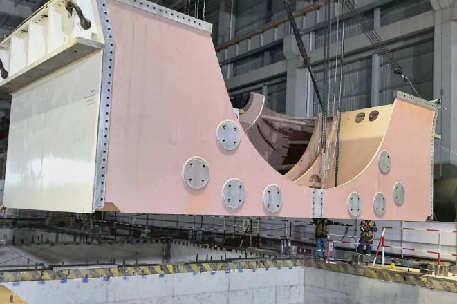 此次吊裝的是低壓外缸下半部分,分為兩半,各重80噸。為確保吊裝作業安全高效推進,項目部在吊裝前組織開展了詳盡的安全技術交底,提前完成了低壓缸墊塊與臺板的研磨安裝、臺板與缸體的研磨接觸檢查,以及低壓外缸的預拼缸等各項準備工作。落缸過程中,項目領導、專業技術人員及安監人員全程旁站監督,嚴格把控每一道工序,確保全過程安全可控、質量可靠。落缸后,項目部專業技術人員嚴格依照設計圖紙細致調整臺板下墊鐵,使二段汽缸在垂直法蘭中分面處保持水平中分面平齊,為后續低壓缸拼缸工作創造了良好條件。