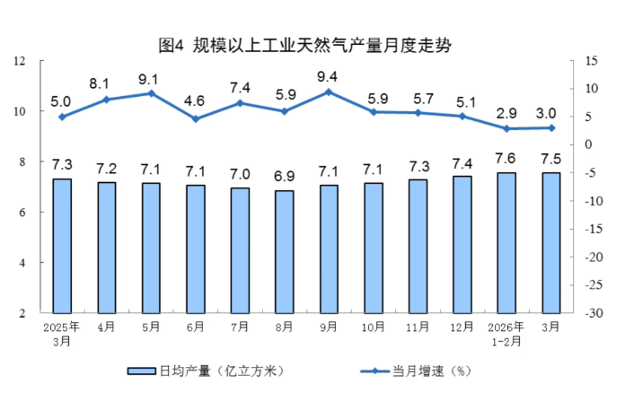 天然氣生產增速加快。3月份,規上工業天然氣產量234億立方米,同比增長3.0%,增速比1—2月份加快0.1個百分點;日均產量7.5億立方米。