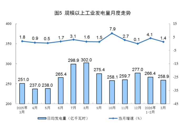 規上工業電力生產穩定增長。3月份,規上工業發電量8025億千瓦時,同比增長1.4%,增速比1—2月份回落2.7個百分點;日均發電258.9億千瓦時。1—3月份,規上工業發電量23782億千瓦時,同比增長3.4%。