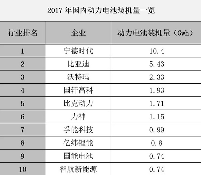 數(shù)據(jù)顯示,在整個(gè)2017年,寧德時(shí)代電池裝機(jī)量以10.4GWh趕超比亞迪,成為新的行業(yè)“一哥”。比亞迪和沃特瑪分別以5.43GWh和2.33GWh排名第二和第三位。在全球范圍內(nèi)看來,如果算上海外市場的的動(dòng)力電池出貨量,CATL的累計(jì)數(shù)據(jù)是12GWh,已經(jīng)超越了排名第二的松下(10GWh),成為了全球范圍內(nèi)最大的動(dòng)力電池供貨商。